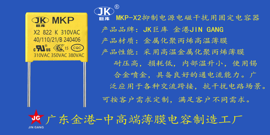 産品品牌 :JK巨庫(kù)金港JINGANG 産品材質: 金(jin)屬化聚丙烯高溫(wen)薄膜 産品性能: 采(cai)用高溫金屬化聚(jù)丙烯薄膜 耐壓高(gāo),損耗低,内部溫升(sheng)小,使用錫合金噴(pen)金, 具備良好的通(tōng)電流能力。 産品作(zuo)用: 廣泛應用于各(ge)種交流跨接,抗幹(gan)擾電路場景。 定制(zhì)加工 :可按客戶需(xu)求定制,滿足客戶(hù)不同需求。