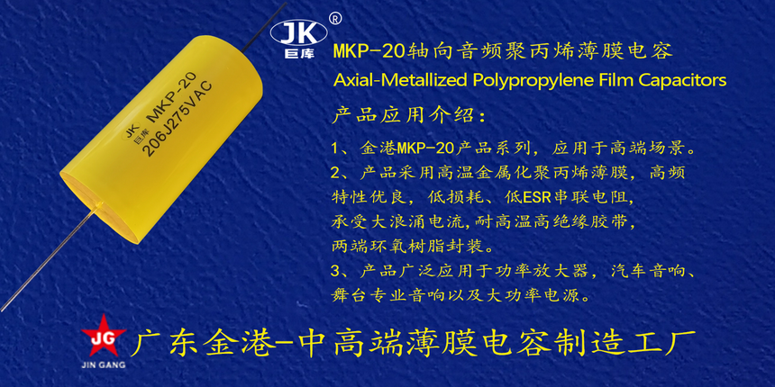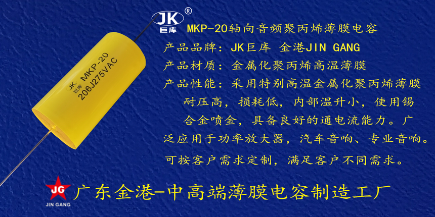 産品品牌 :JK巨(ju)庫金港JINGANG 産品(pin)材質: 金屬化(huà)聚丙烯高溫(wēn)薄膜 産品性(xing)能: 采用高溫(wēn)金屬化聚丙(bǐng)烯薄膜 耐壓(yā)高,損耗低,内(nei)部溫升小,使(shi)用錫合金噴(pēn)金, 具備良好(hao)的通電流能(neng)力。 産品作用(yong): 廣泛應用于(yú)功率放大器(qì),汽車音響、專(zhuan)業音響。 定制(zhì)加工 :可按客(kè)戶需求定制(zhi),滿足客戶不(bu)同需求。