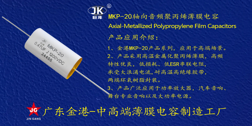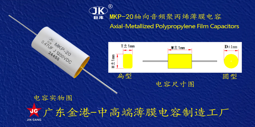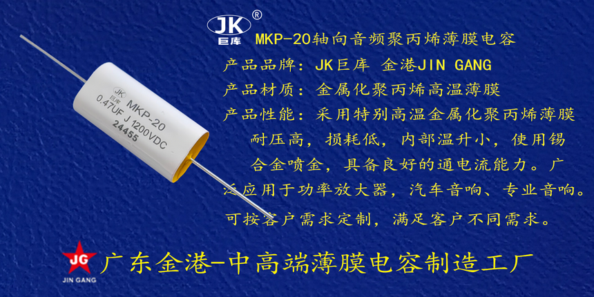 産品(pin)品牌 :JK巨庫金(jīn)港JINGANG 産品材質(zhi): 金屬化聚丙(bing)烯高溫薄膜(mo) 産品性能: 采(cai)用高溫金屬(shu)化聚丙烯薄(báo)膜 耐壓高,損(sǔn)耗低,内部溫(wen)升小,使用錫(xi)合金噴金, 具(jù)備良好的通(tōng)電流能力。 産(chan)品作用: 廣泛(fan)應用于功率(lü)放大器,汽車(chē)音響、專業音(yin)響。 定制加工(gōng) :可按客戶需(xū)求定制,滿足(zú)客戶不同需(xu)求。