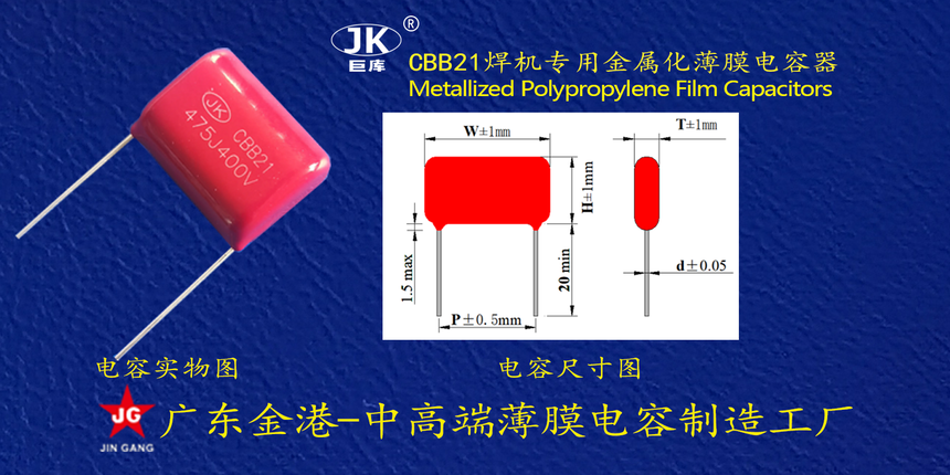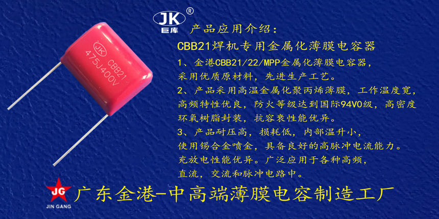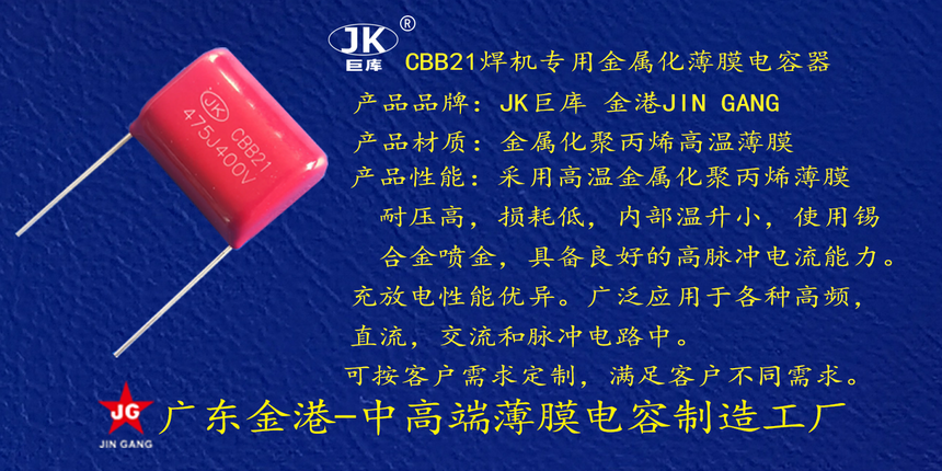 産品品(pǐn)牌 :JK巨庫金(jin)港JINGANG 産品材(cai)質: 金屬化(hua)聚丙烯高(gāo)溫薄膜 産(chan)品性能: 采(cǎi)用高溫金(jīn)屬化聚丙(bing)烯薄膜 耐(nai)壓高,損耗(hao)低,内部溫(wen)升小,使用(yòng)錫合金噴(pēn)金, 具備良(liang)好的高脈(mo)沖電流能(neng)力。 産品作(zuo)用: 廣泛應(yīng)用于各種(zhong)交流跨接(jie),抗幹擾電(diàn)路場景。 定(ding)制加工 :可(kě)按客戶需(xū)求定制,滿(mǎn)足客戶不(bu)同需求。