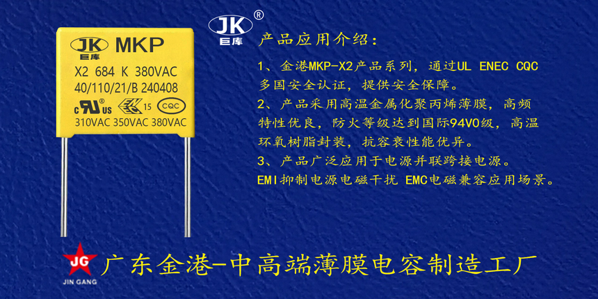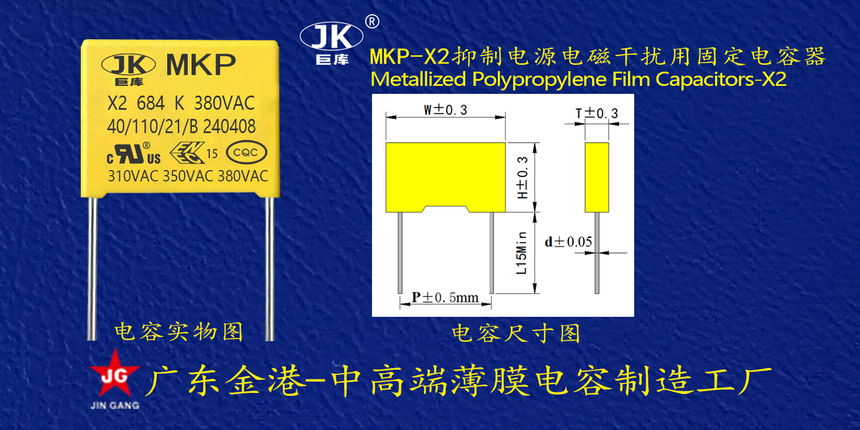 産品(pin)品牌 :JK巨庫金港JINGANG 産(chǎn)品材質: 金屬化聚(ju)丙烯高溫薄膜 産(chan)品性能: 采用高溫(wen)金屬化聚丙烯薄(bao)膜 耐壓高,損耗低(di),内部溫升小,使用(yong)錫合金噴金, 具備(bei)良好的通電流能(neng)力。 産品作用: 廣泛(fan)應用于各種交流(liú)跨接,抗幹擾電路(lu)場景。 定制加工 :可(kě)按客戶需求定制(zhì),滿足客戶不同需(xū)求。